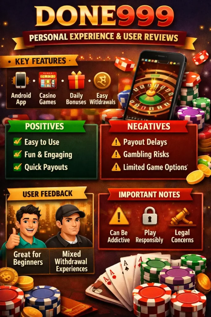 Done999 game is a popular mobile casino app in Pakistan that combines entertainment with real-money earning opportunities. Users highlight its smooth performance, easy withdrawals, and beginner-friendly interface, though some caution about the risks of gambling and inconsistent payout experiences.
